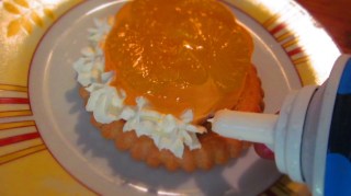 - Точно преди сервирането на десерта, декорирах с готова сметана от флакон.