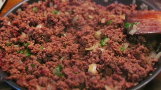 - В подходящ по размер тиган изсипвам 3 с. л. олио. Загрявам на котлона и добавям каймата като я пържа с постоянно разбъркване, за да се раздроби на малки парченца. Добавям и ситно нарязания пресен лук. Подправям със сол, черен пипер и магданоз и оставям на страна да изстине добре. Когато каймата е добре изстинала, натрошавам сиренето и разбърквам.