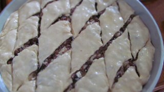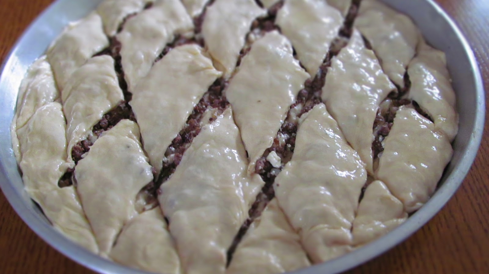 - Намазвам тавата обилно с мазнина. Слагам първата кора и я поръсвам обилно с мазнина. Слагам втората кора и също я поръсвам с мазнина. Разстилам половината от каймата и слагам третата и четвъртата кора, като ги ръся с мазнина. Разстилам останалата кайма и нареждам петата и шестата кора, като ги поръсвам обилно с мазнина. Трябва да се усвои цялата чаша мазнина.