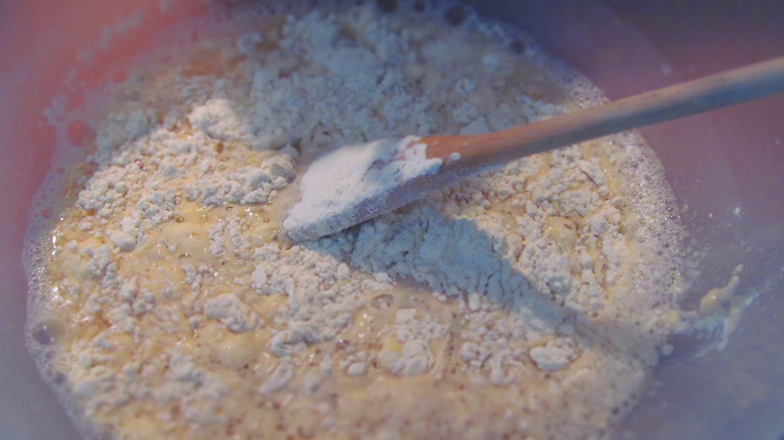 - В подходяща по размер купа изсипвам топлата вода и разтварям в нея маята, заедно със захарта. Добавям яйцето, 1 с. л. олио и солта. С постоянно разбъркване на сместта, добавям и малко по малко брашното и така докато се поучи меко тесто. Завивам тестото с влажна кърпа и го оставям да почива половин час.