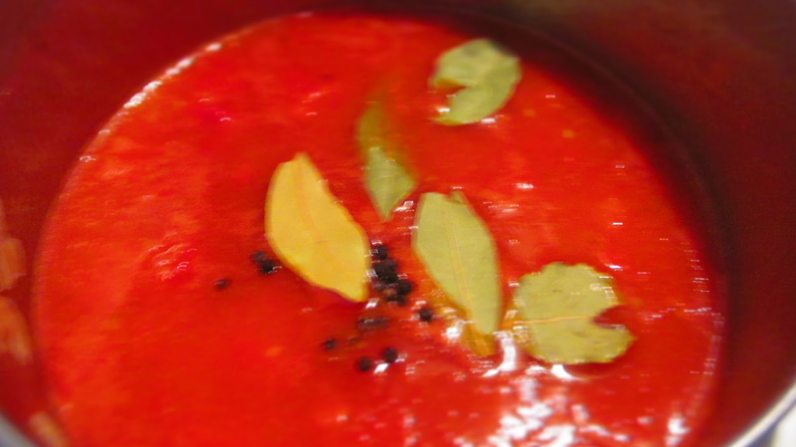 - Добавям дафиновите листа и зърната черен пипер, подправям на вкус със сол. Намалявам котлона и оставям ястието да къкри.