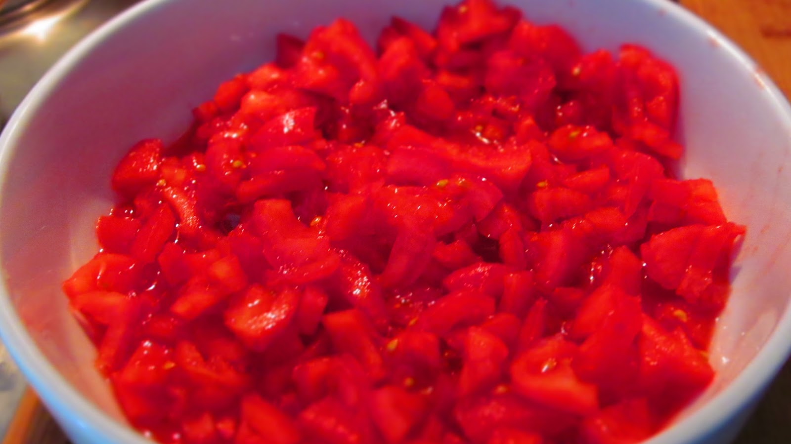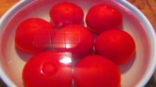- В дълбока купа подреждам доматите и ги заливам с вряща вода. Това правя с цел, по-лесното обелване на доматите.