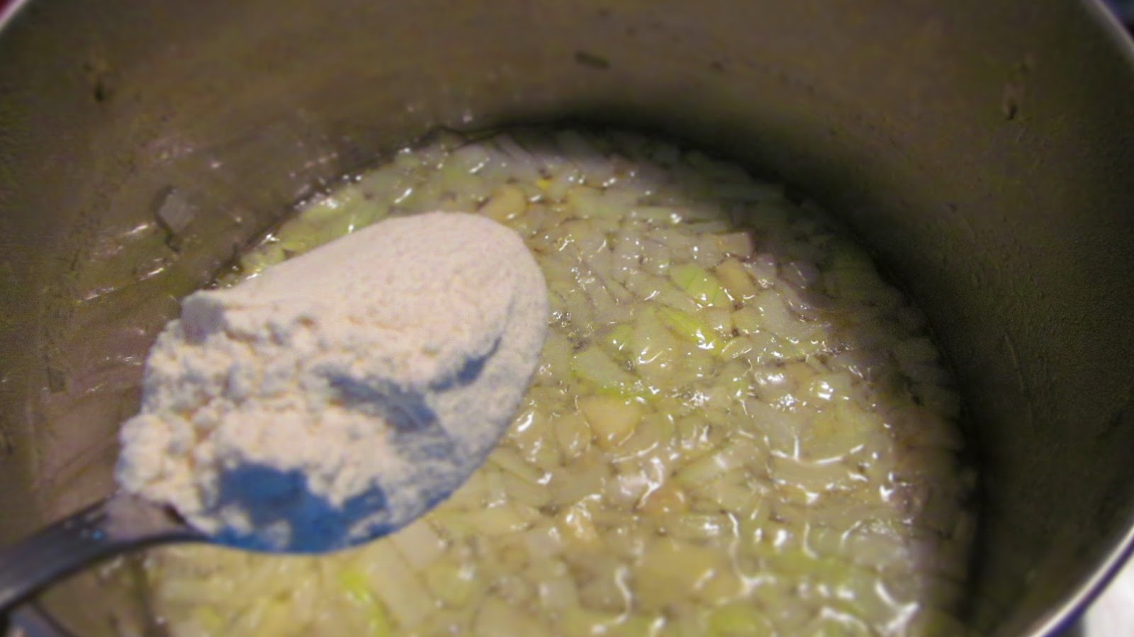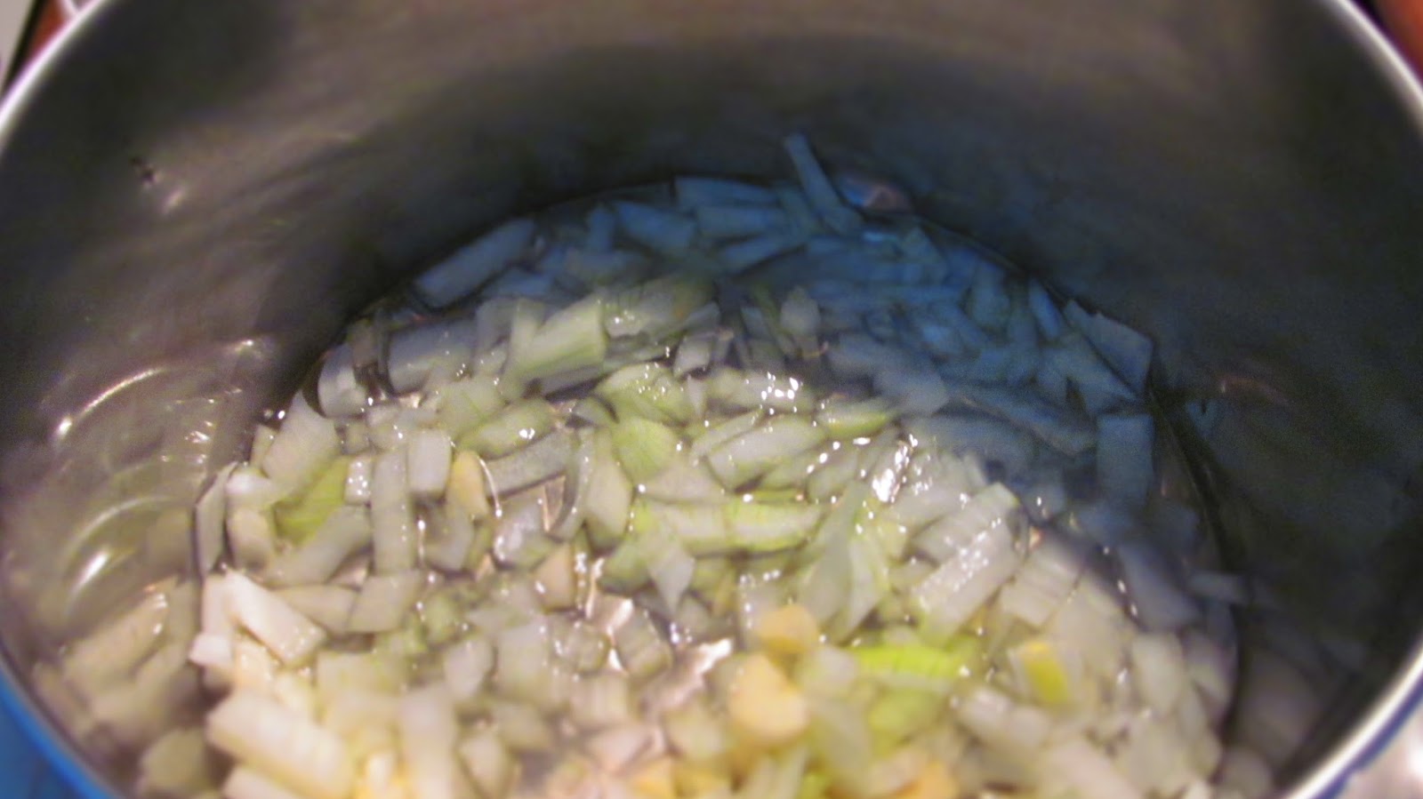 - В подходяща тенджерка сипвам 2 – 3 с. л. олио и изпържвам за кратко ситно нарязаните лук и чесън.