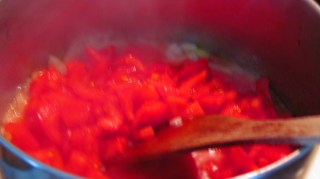 - Добавям ситно нарязаните домати и заливам с месния бульон.