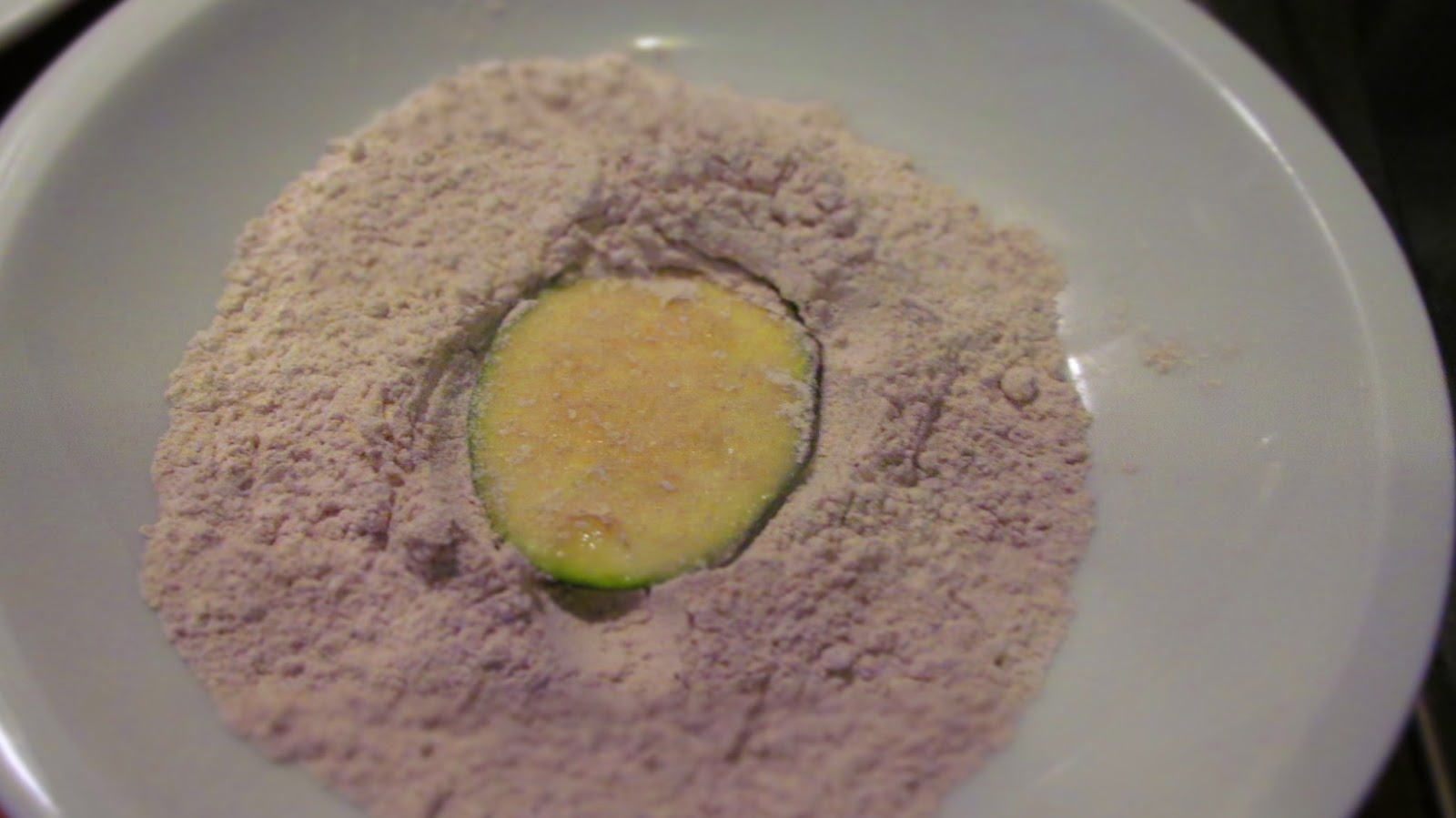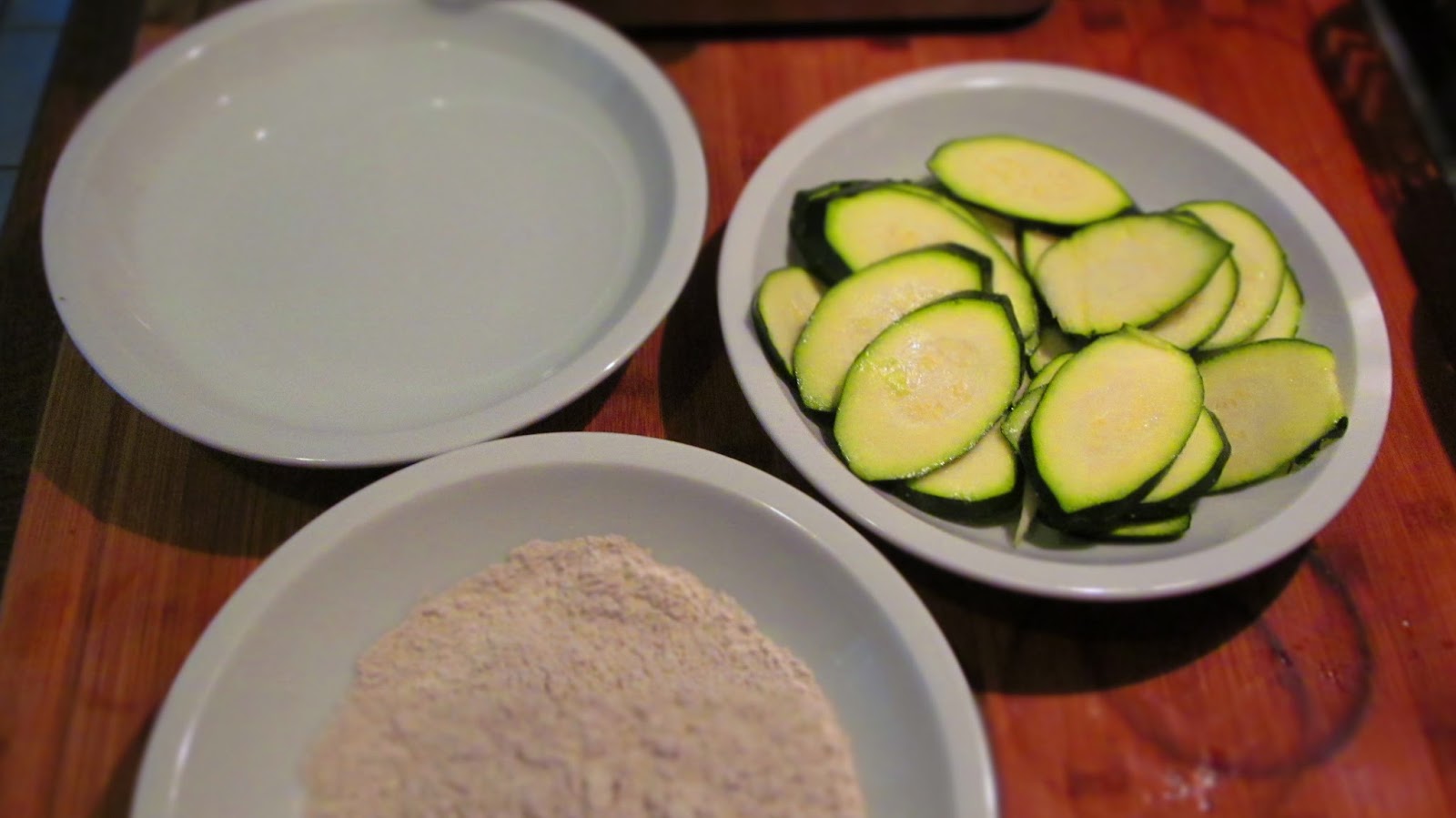 - В дълбоки чинии си приготвям студена вода за потапяне, брашно за овалване и осолените тиквички.