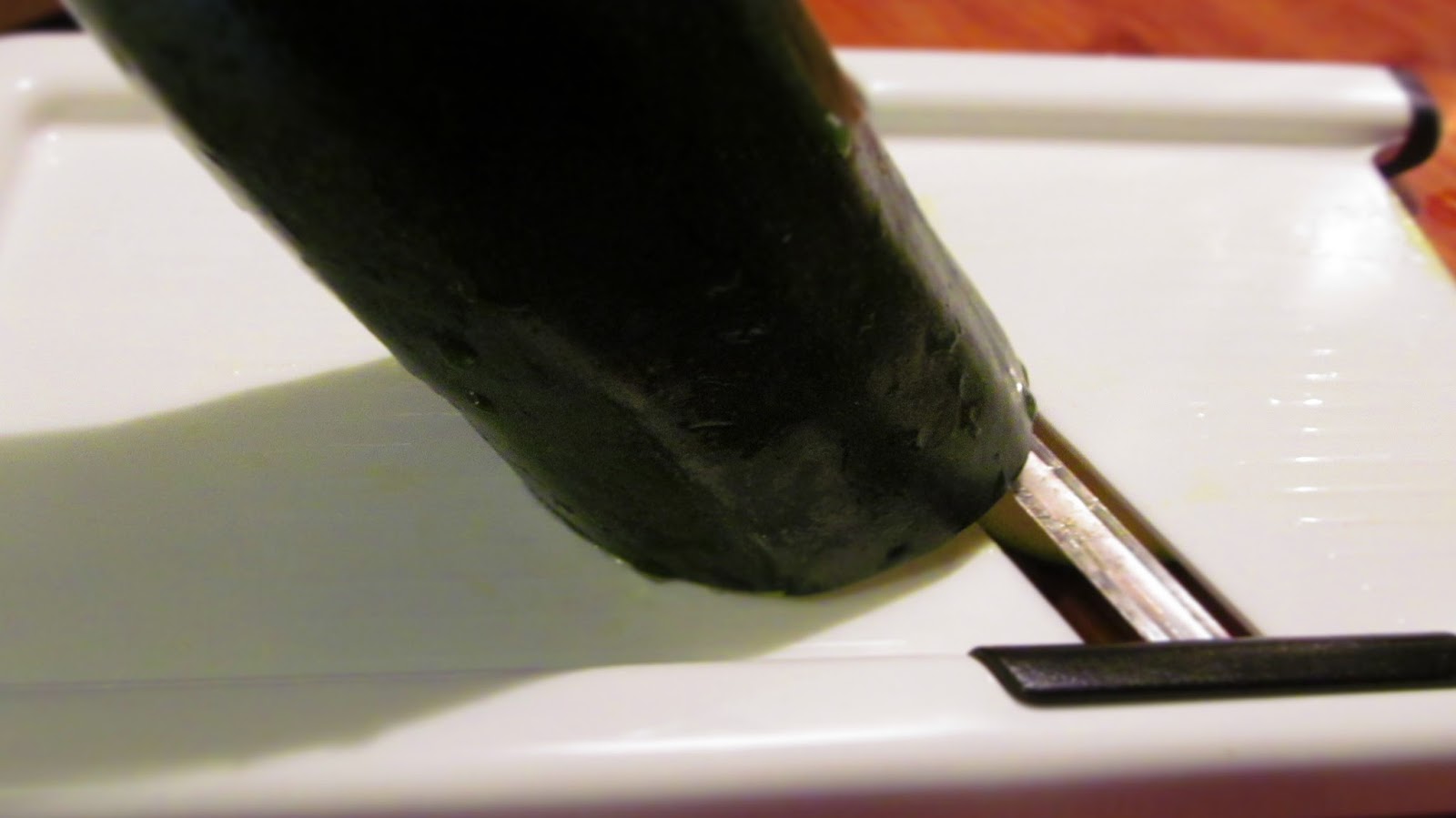 - С помощта на ренде, нарязвам тиквичките на много тънки филийки.