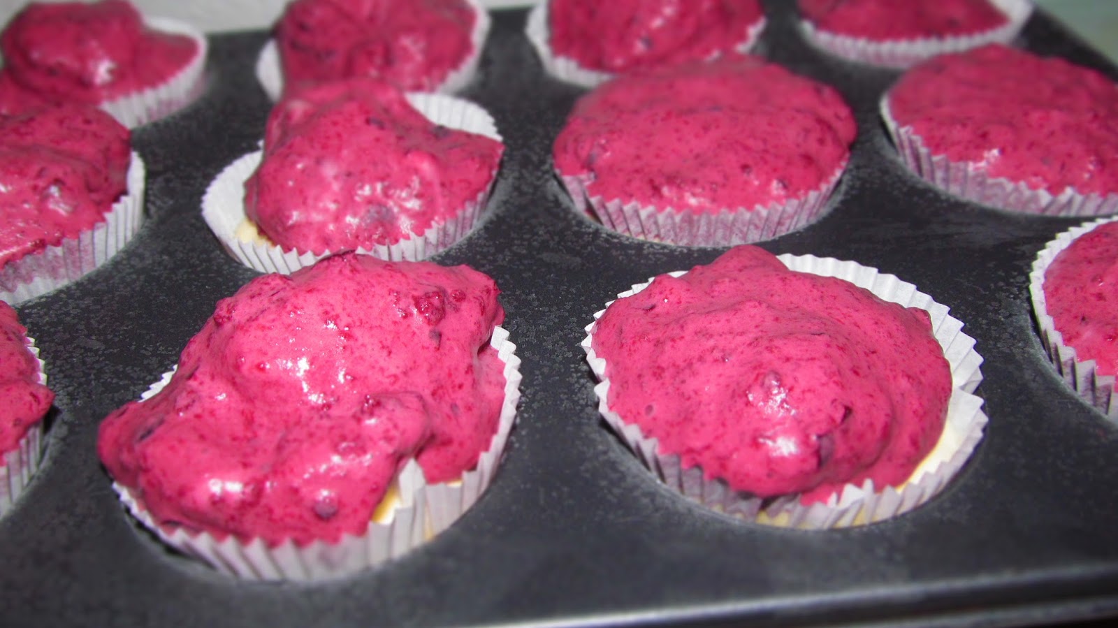 - В тавичка за мъфини с 12 гнезда, поставих хартиените формички. Във всяка формичка сипах от крема като запълвъх само 3/4 от обема на всяко гнездо.