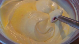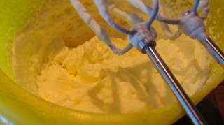 - В друга купа смесих крема сиренето, останалата ванилия, жълтъците, 125 гр. захар и сокът на лимона.