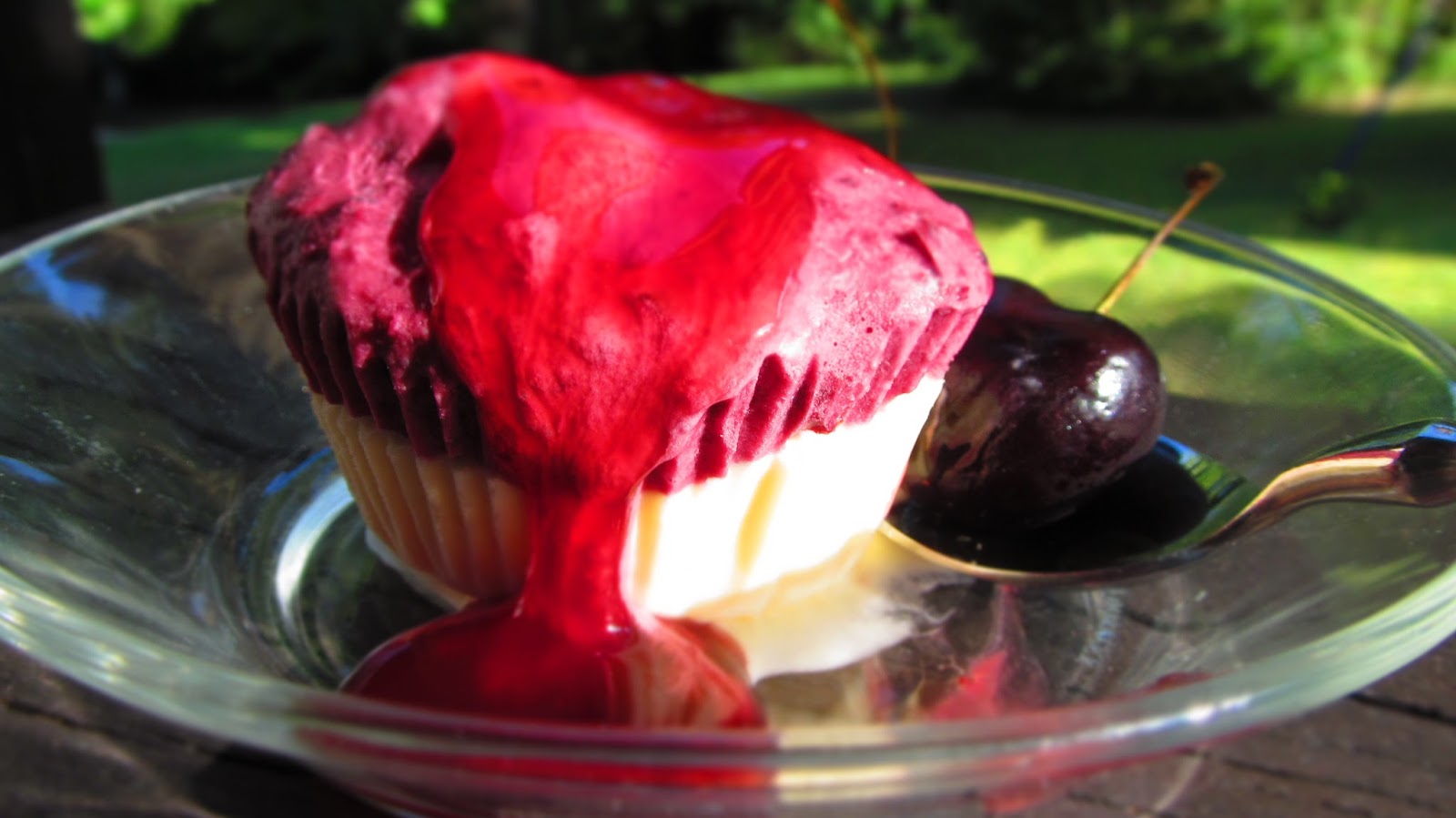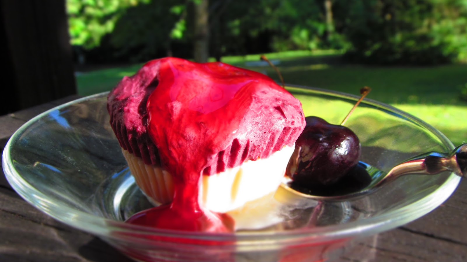 Комбинацията от крема сирене, разбита сметана и черешово пюре е много добра. Завършекът на този десерт, с форма на мъфини е черешовият сос.