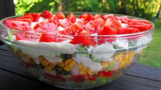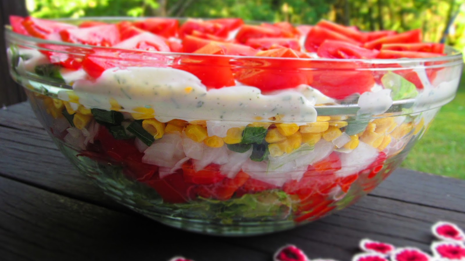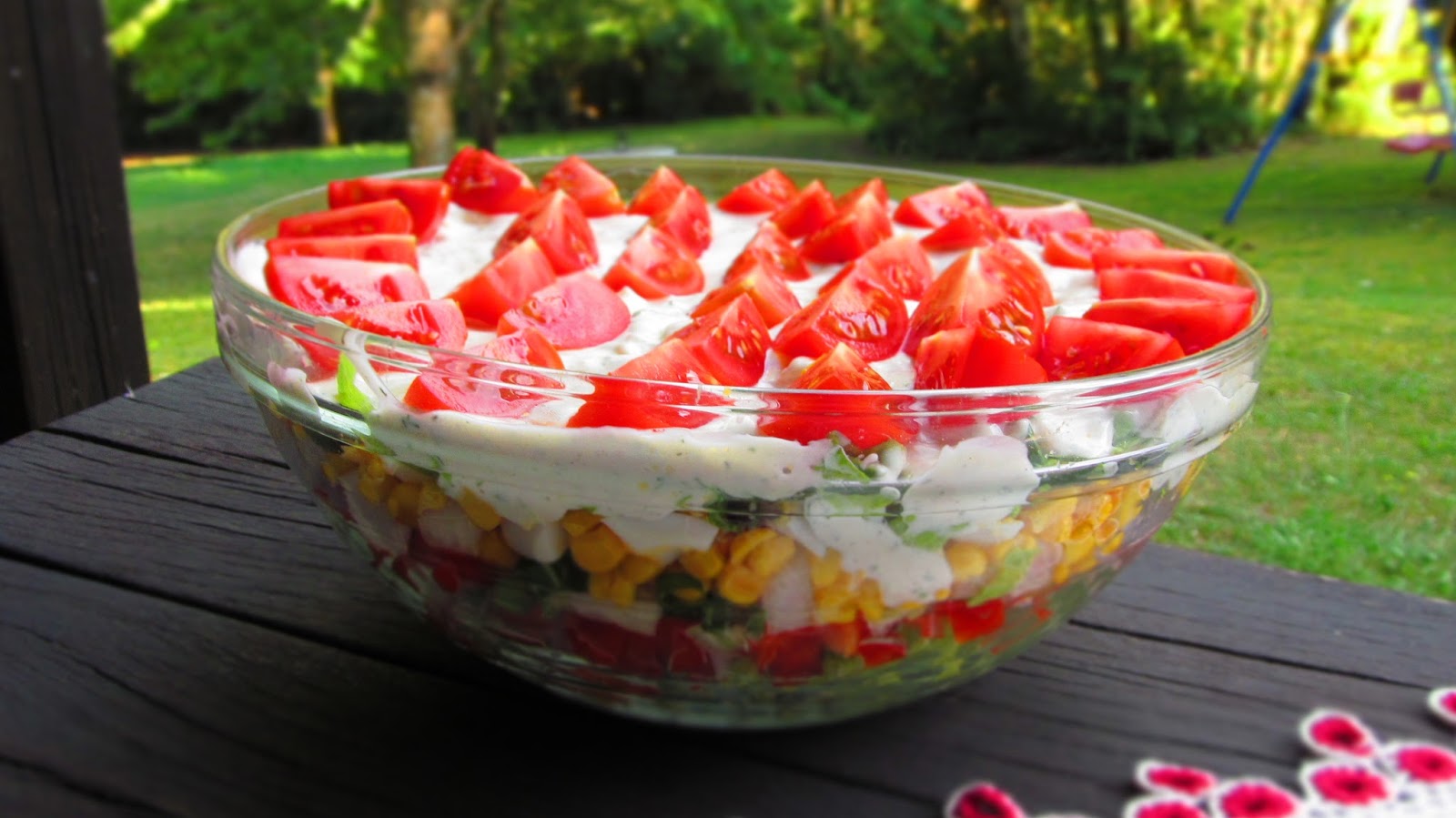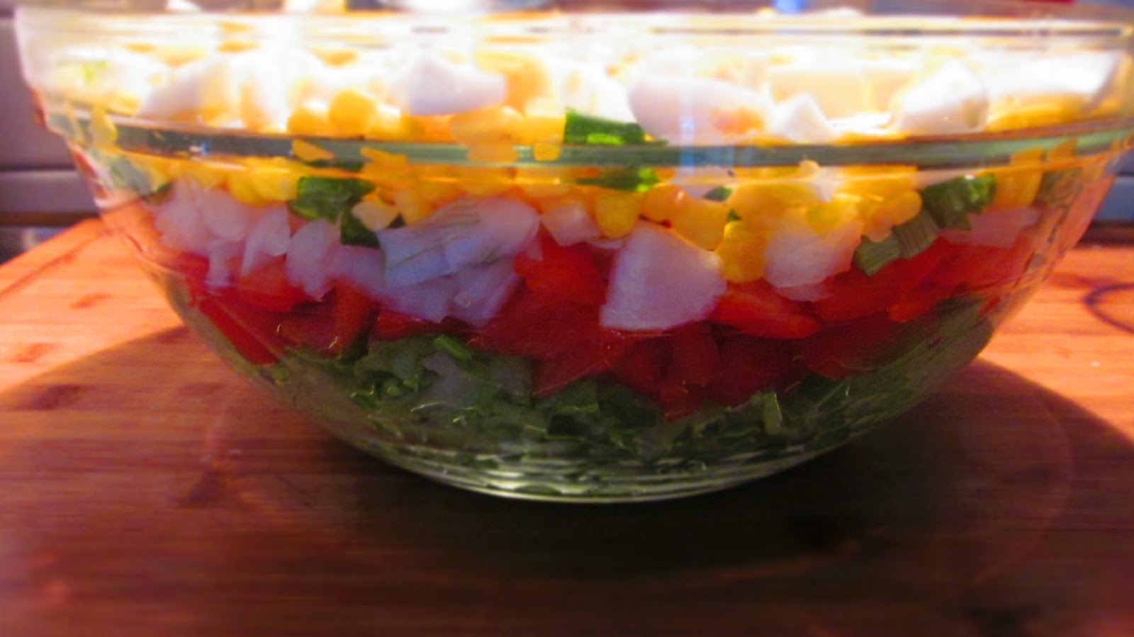 - В голяма стъклена купа слагам половината от зелената салата, цялото количество чушки, цялото количество зелен лук, цялото количество царевица, цялото количество яйца и накрая покривам с останалото количество зелена салата. Старая се при подреждането на различните продукти да се получат красиви цветни редове – пластове.