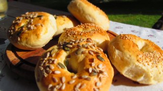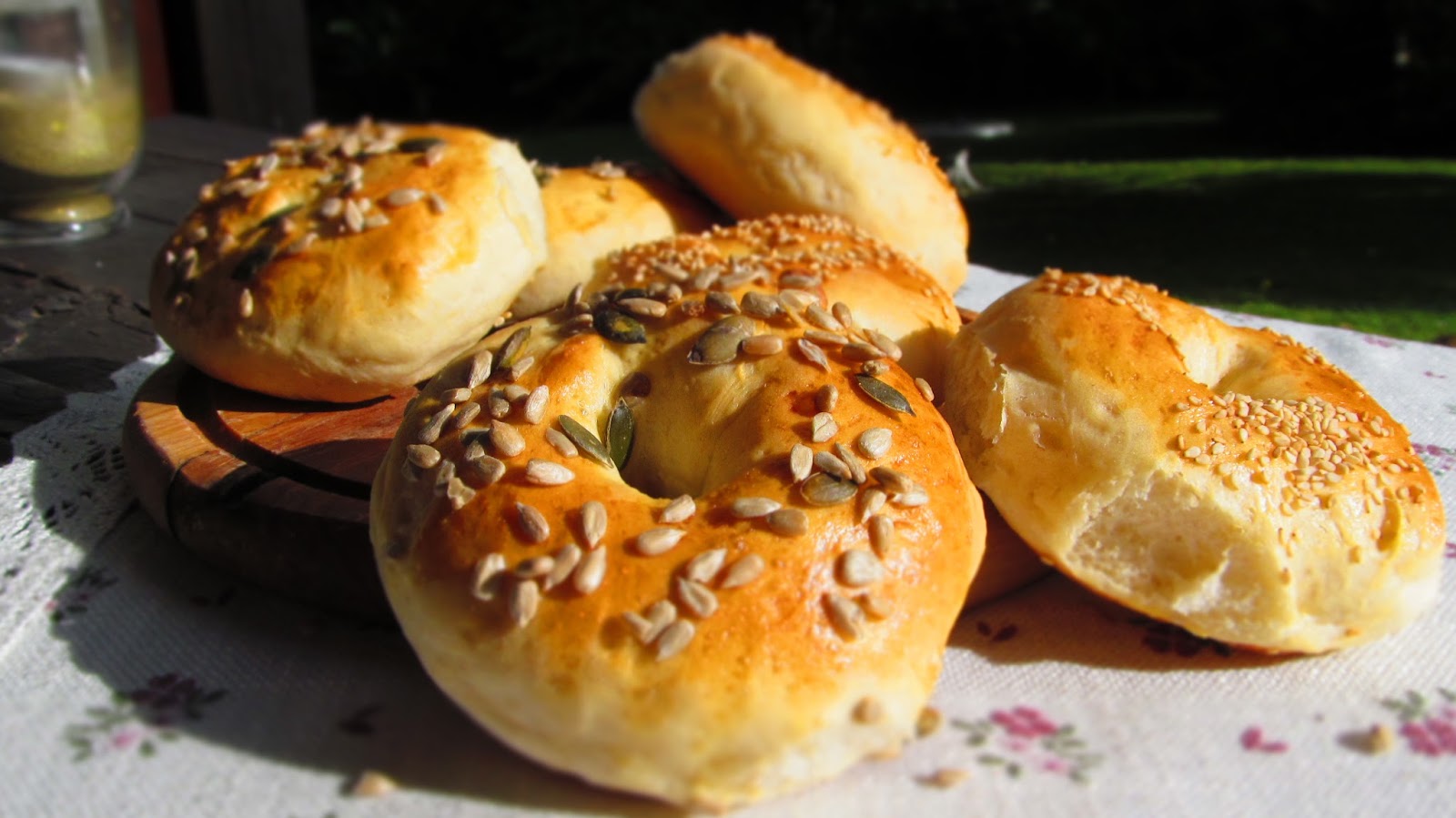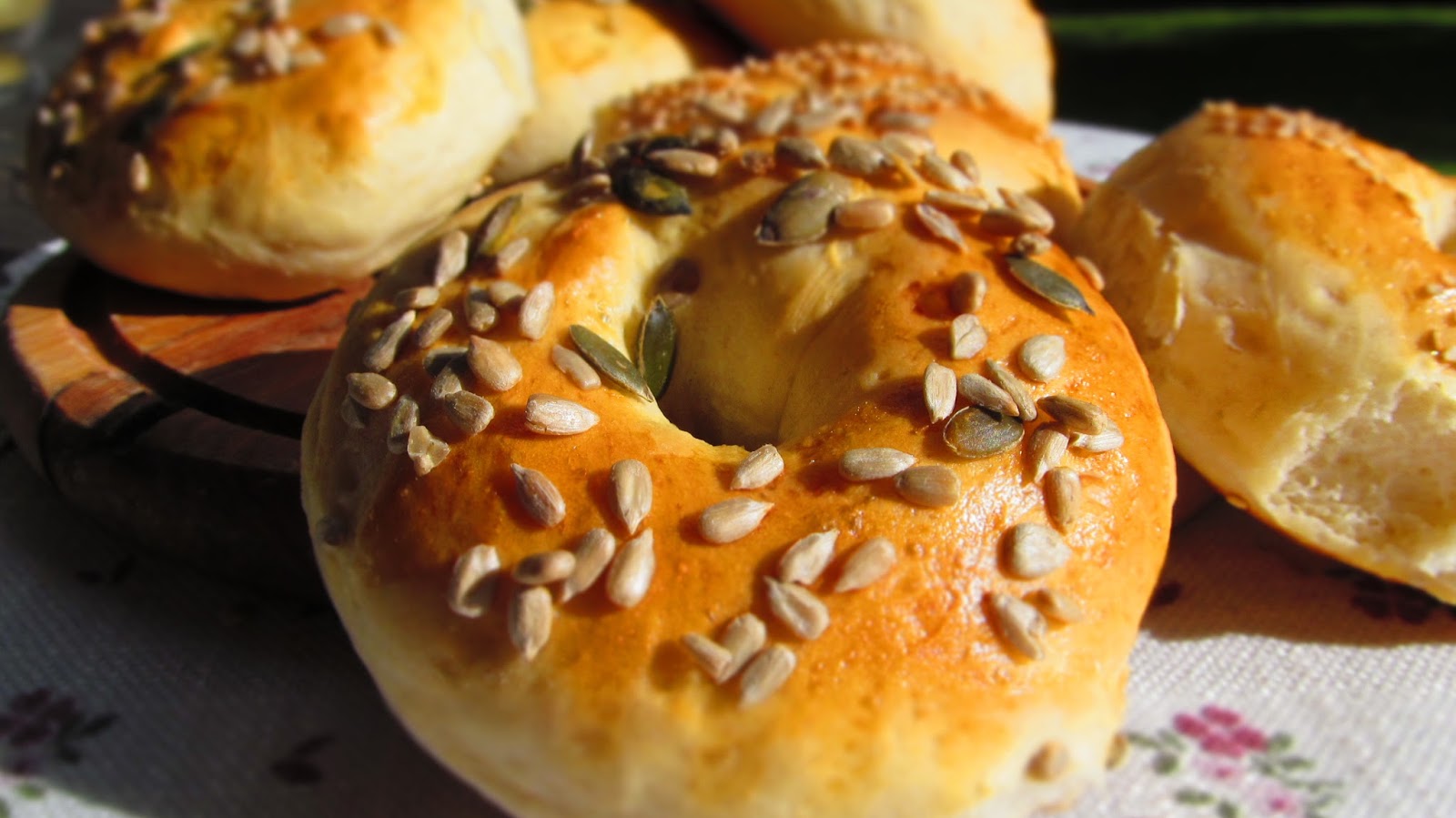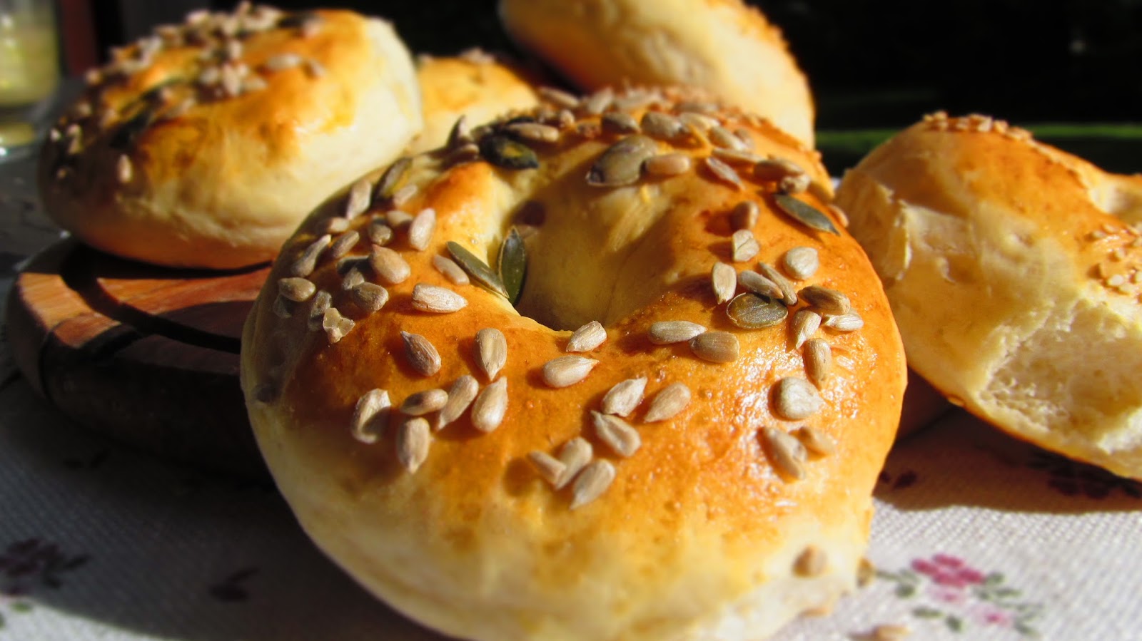 • Втасалите бейгъли намазвам с разбит жълтък, поръсвам със семена и тогава изпичам в предварително загрята до 200 градуса фурна за около 20 – 25 минути.