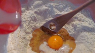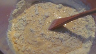 • Започвам да бъркам с дървена лъжица и да добавям постепенно от топлата вода и брашното към съставките в кладенчето и така, докато свърши всичката вода.
