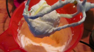 - Разбивам сметаната с ванилията и втвърдителя за сметана.