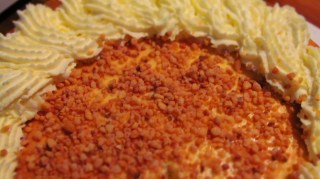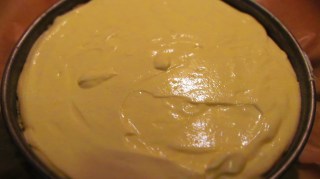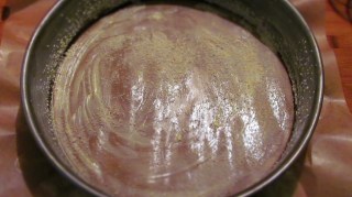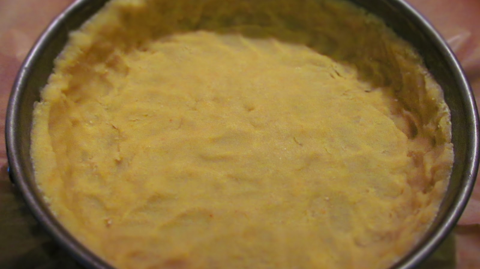 - Добре охладеното тесто разстилам във формата като се старая еднакво да се разпредели по дъното на формата и възможно най-високо по стените на формата.