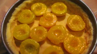 - Върху тестото подреждам половинките праскови, добре изцедени от сока.