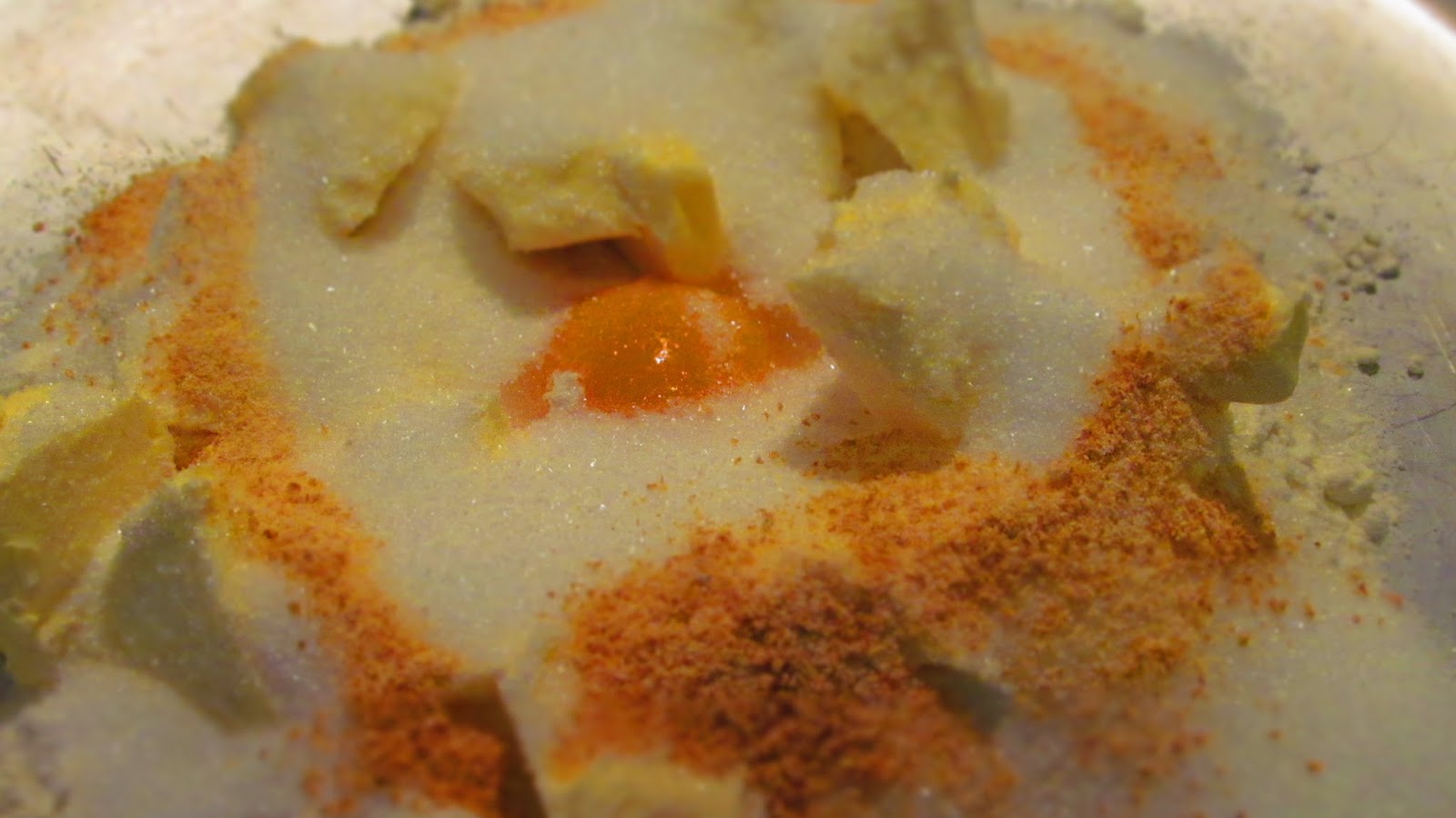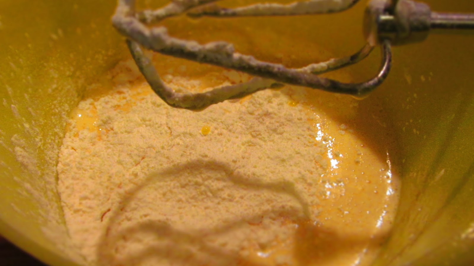 - В една по-голяма тава изсипвам брашното и оформям от него купчинка. Върха на купчинката оформям като кратер на вулкан и в този кратер чуквам яйцето, добавям маслото, накъсано на малки парченца, захарта и настърганата портокалова кора.