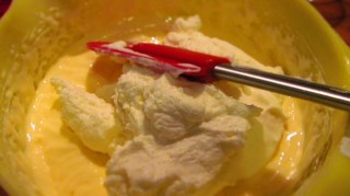 - Разбивам сметаната до сняг и добавям в крема, но не разбивам повече с миксер, а размесвам само със силиконовата бъркака.