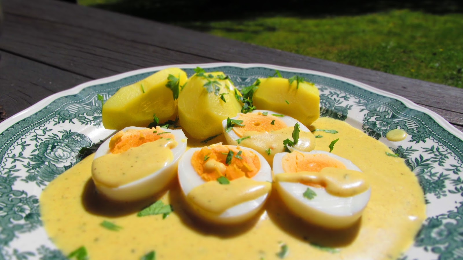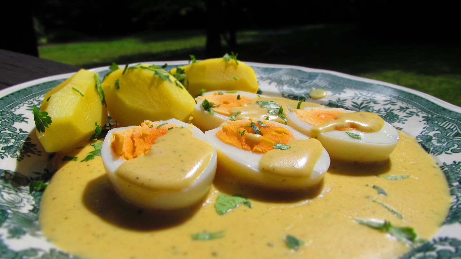 Сервирам яйцата разрязани на половина, поляти със сос с горчица и като гарнитура варените картофи. Поръсвам всичко със ситно нарязан магданоз.