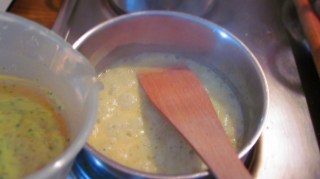 - Заливам изпърженото до златисто брашно с бульона и бъркам, намалявам котлона на средна мощност.