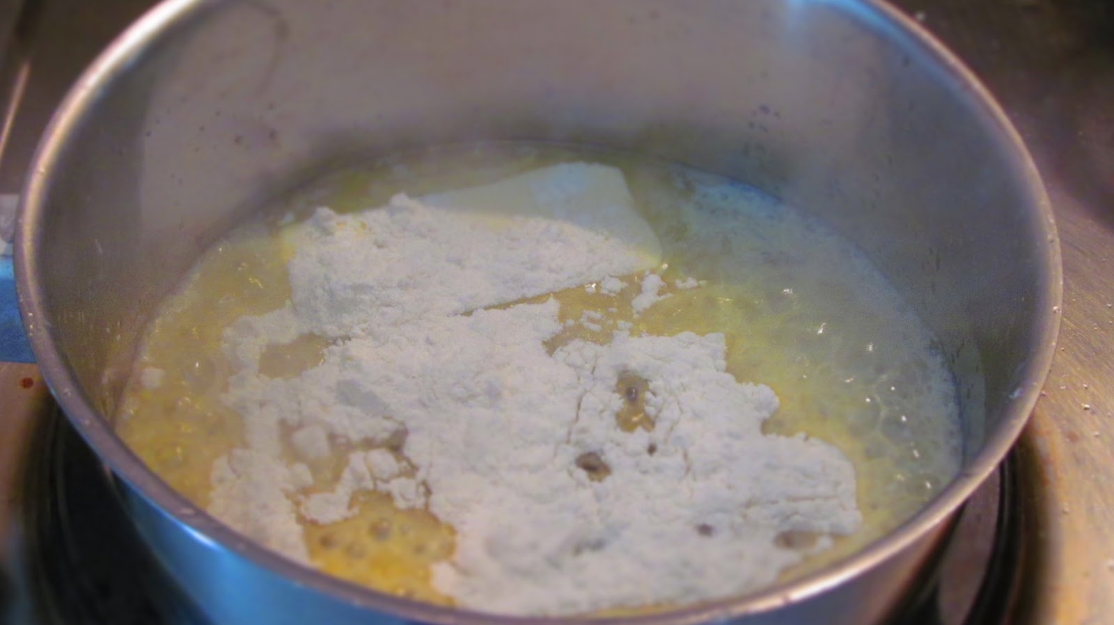 - Добавям брашното и разбърквам. Пърженето на брашното е за секунди.