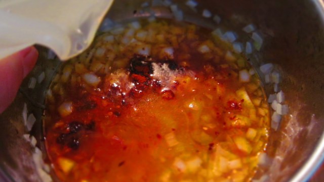 - Изсипвам сладкия червения пипер, разбърквам и веднага заливам с горещия бульон.