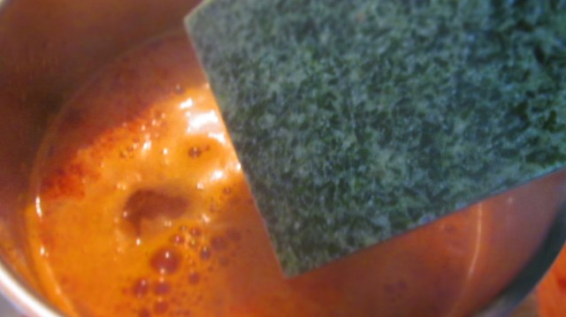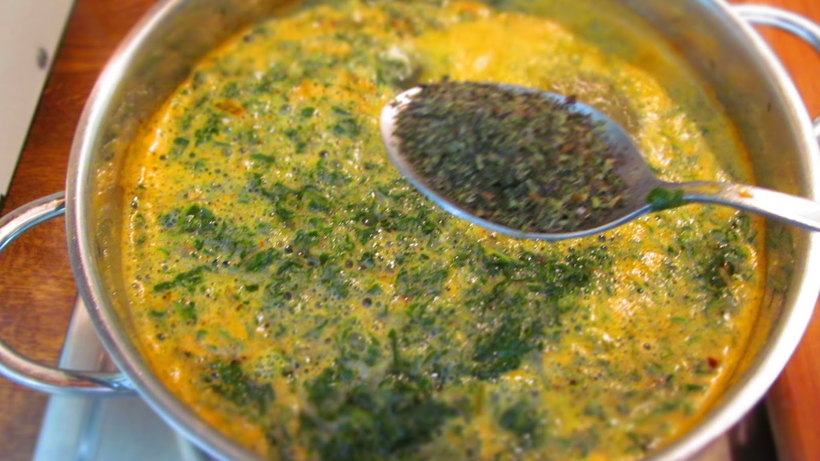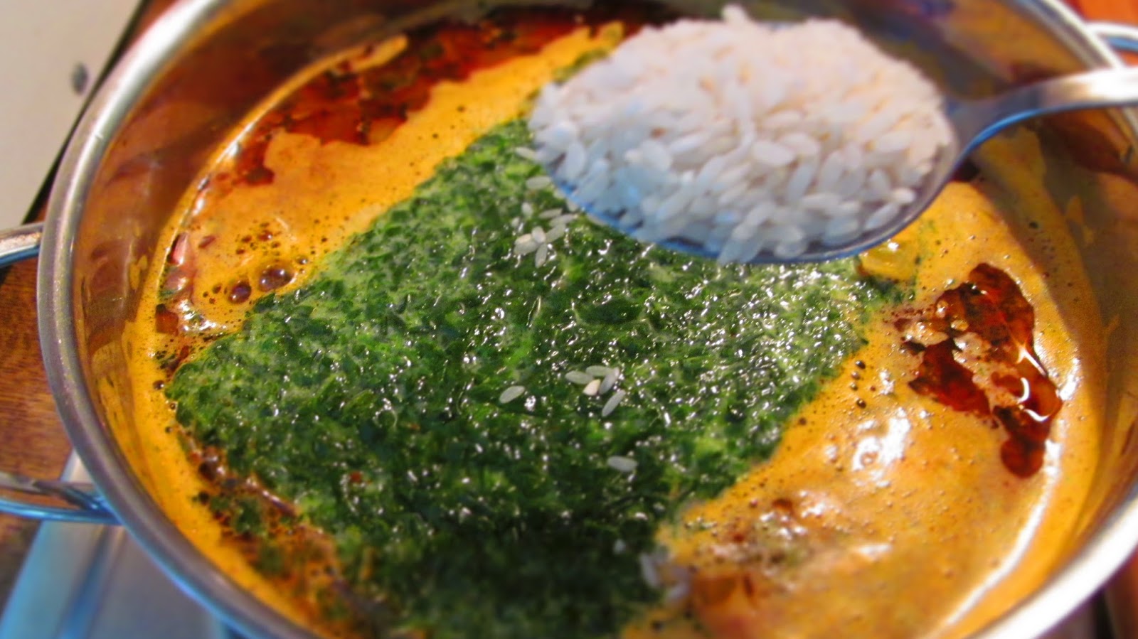 - Котлонът е на максимална степен, бульонът завира бързо и пускам замразенто кубче спанак със сметана.
