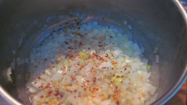 - В подходяща по размер тенджера загрявам олиото и изпържвам до прозрачно ситно нарязания кромид лук.