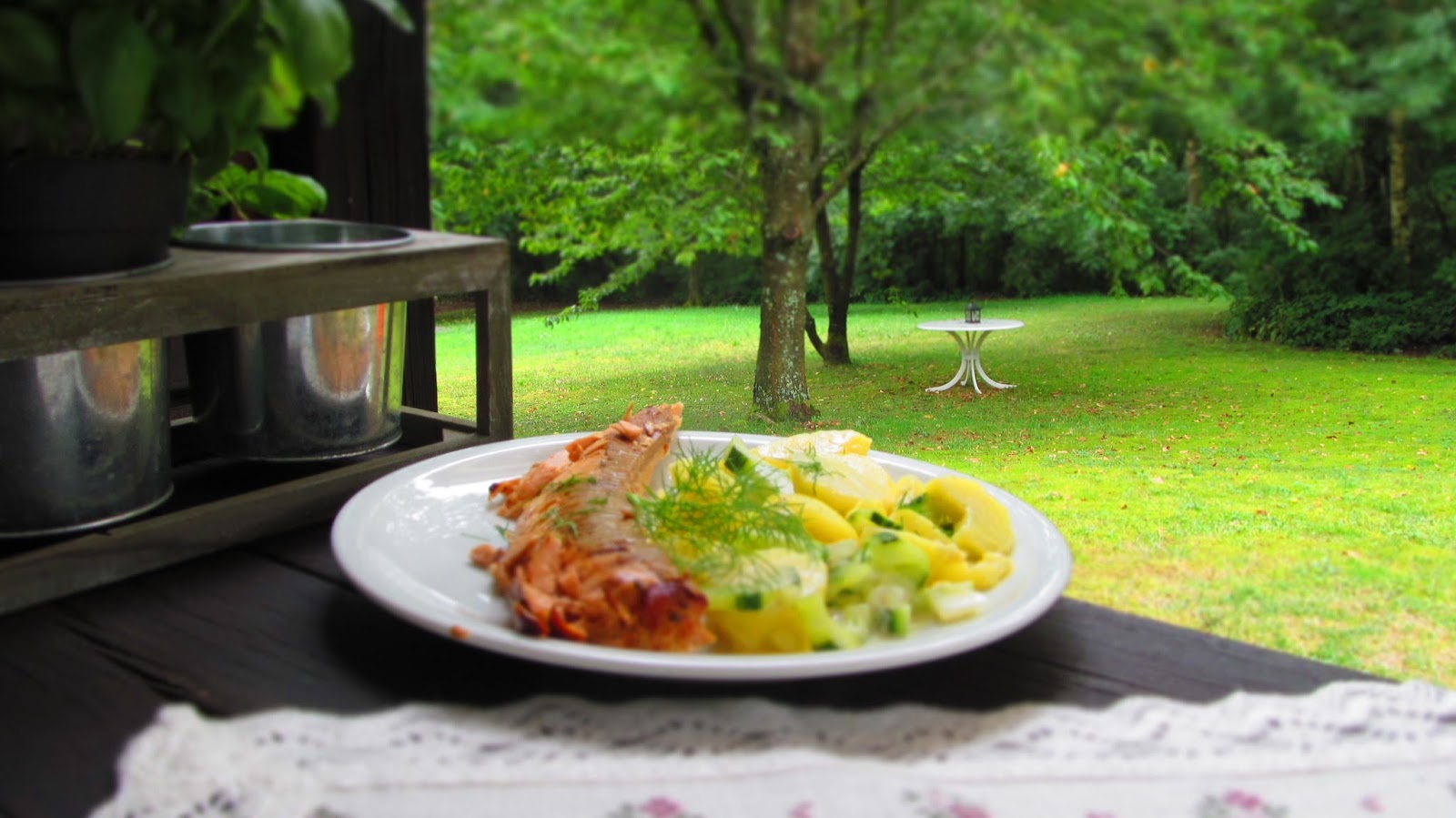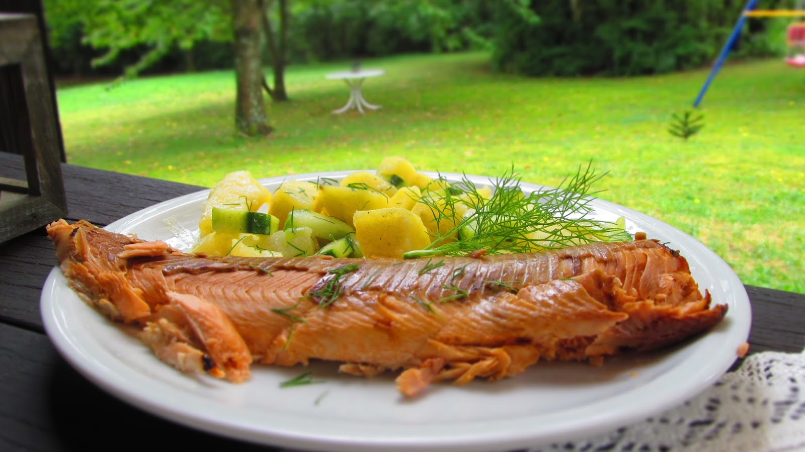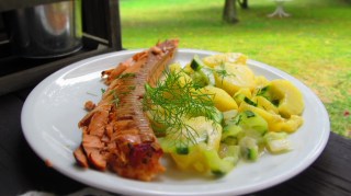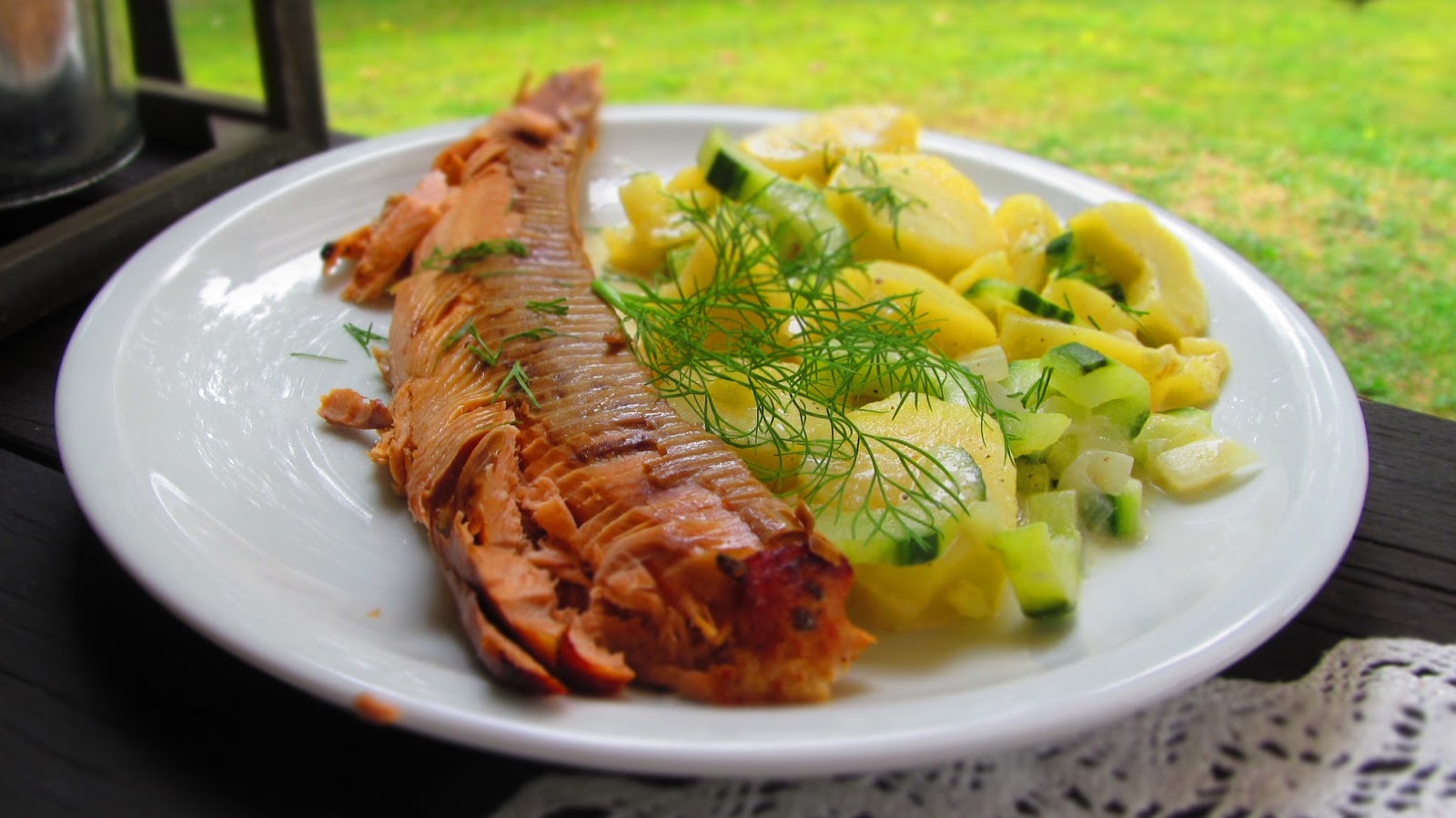 - Докато сьомгата се пече, приготвям гарнитурата. А именно салата от варени картофи с краставица. Страхотно допълнение към ухаещата от фурната риба.