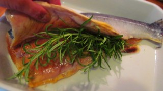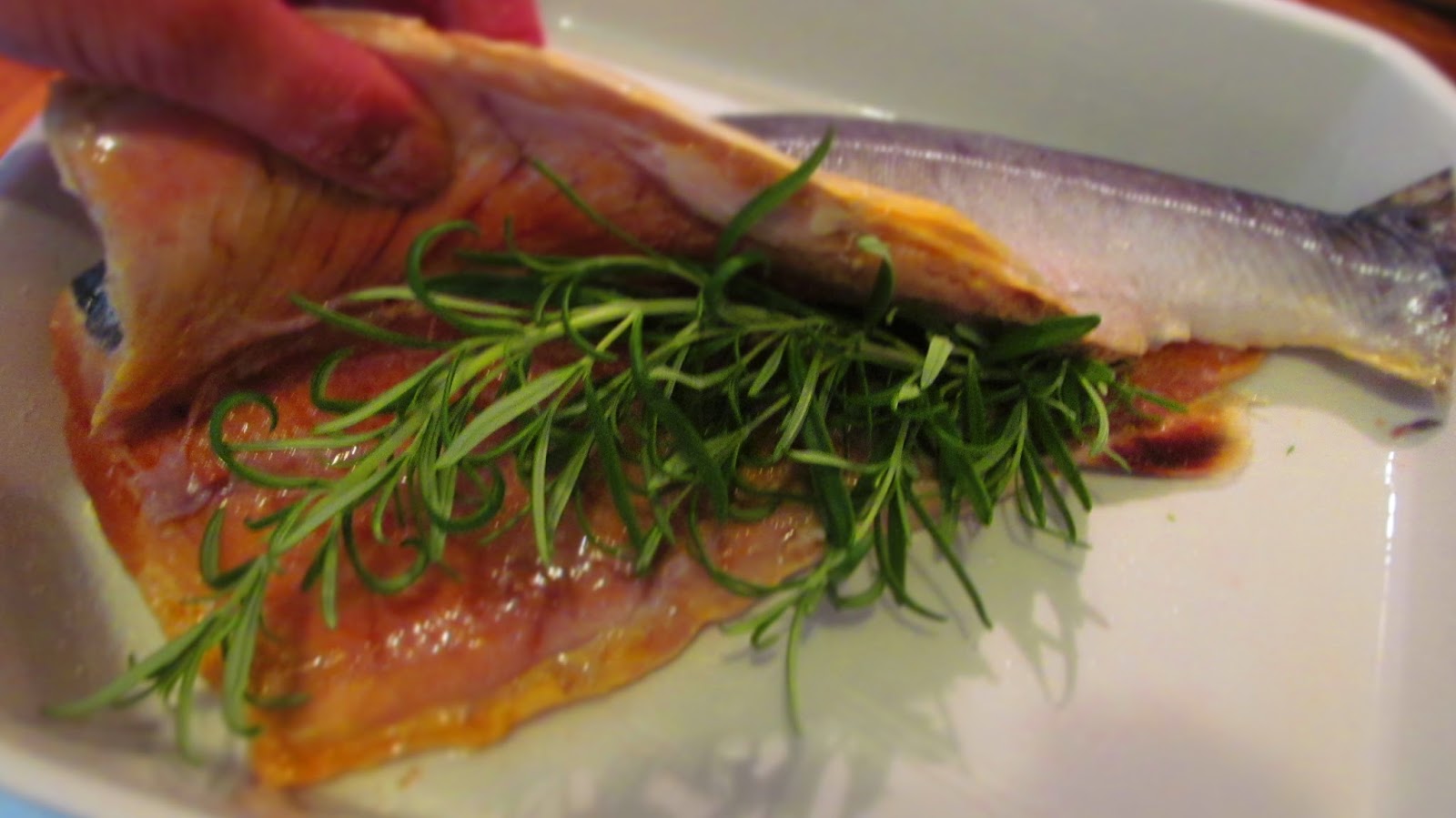 - Слагам рибата в обилно намаслената тавичка и в коремчето й слагам добре измитите стръкчета розмарин.