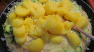 - Щом бульонът заври, изключвам котлона и добавям нарязаните на едри кубчета сварени картофи. Разбърквам.