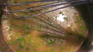 - Разрязвам лимона на две половини и изстисквам сока в същата тенджерка. Добавям 4 с. л. олио, мед и ситно нарязания копър /оставям си малко от копъра за декорация/. Разбърквам добре.