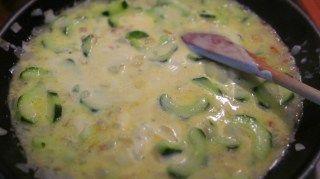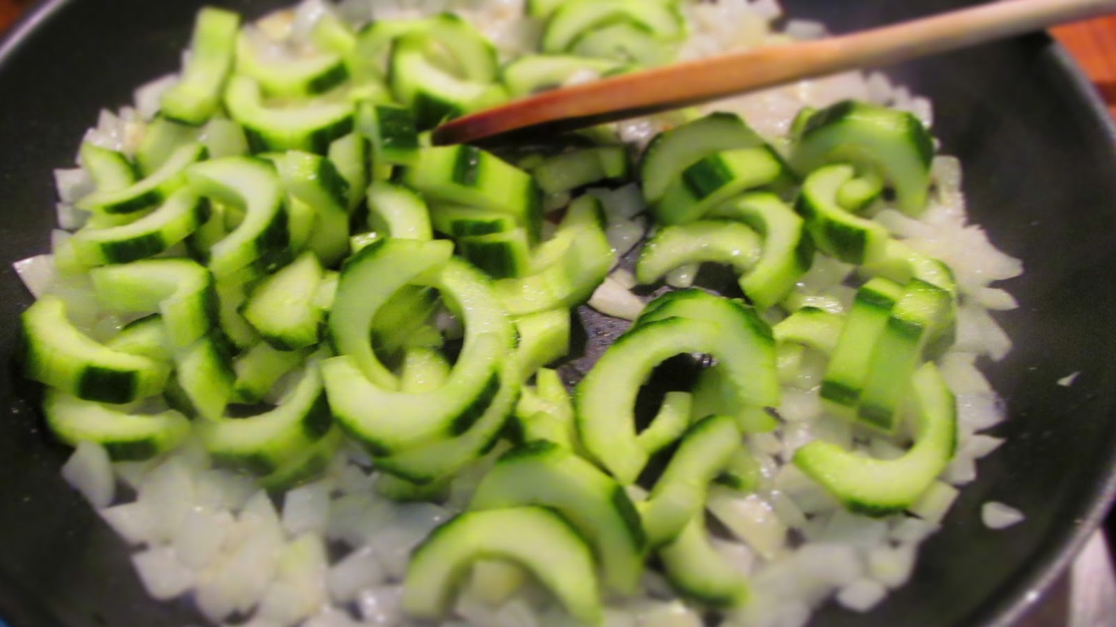- Загрявам 2 супени лъжици олио в подходящ тиган. Изпържвам нарязания на ситно кромид лук до прозрачен и добавям краставиците. Изпържвам за кратко.