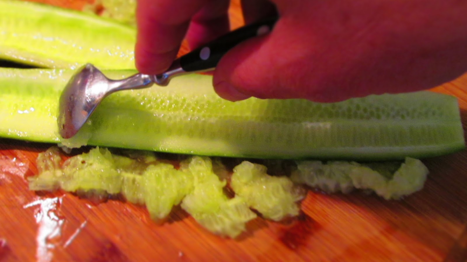 - Обелвам краставицата, разрязвам на половина по дължина и с помощта на малка лъжичка отстранявам семената.