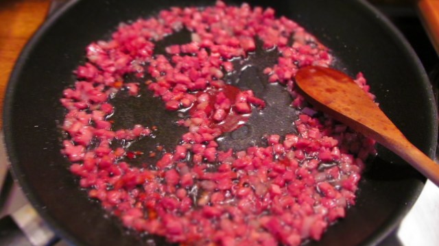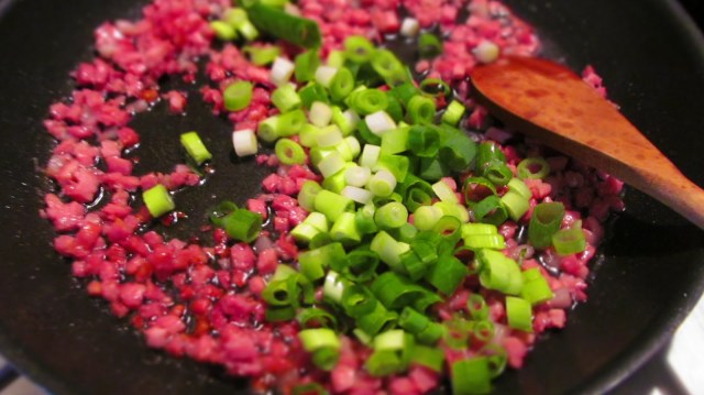 - Загрявам 3 с. л. олио и изпържвам за кратко бекончетата.