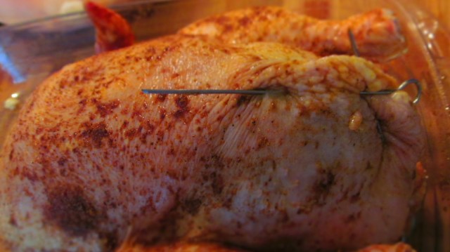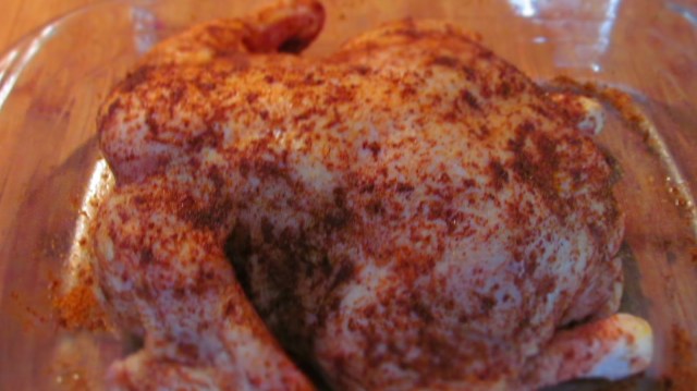 - Намазвам отвън и отвътре обилно с подправката за печено пиле.