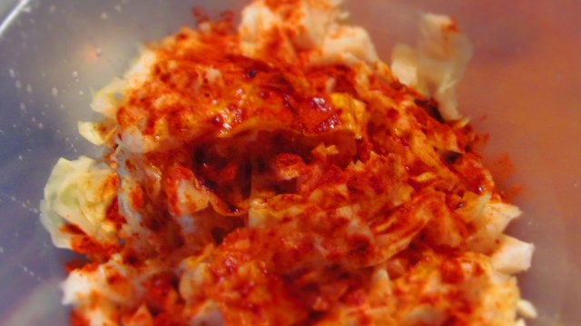 - Киселото зеле нарязвам на ситно, подправям с олио и червен пипер.