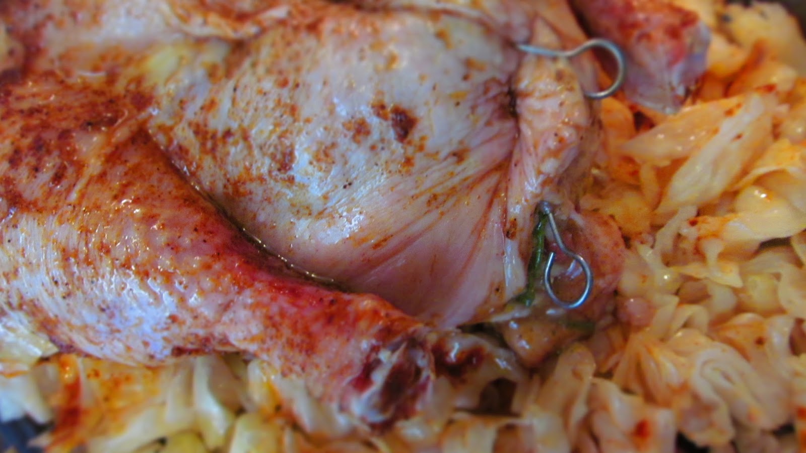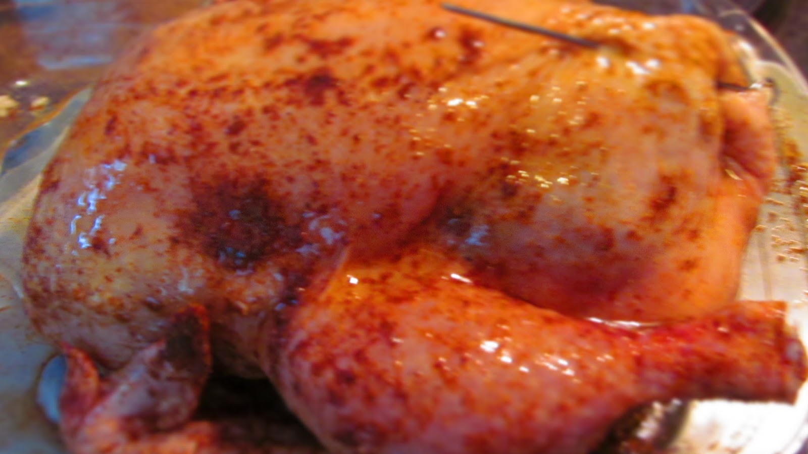 - Намазвам отвън и отвътре обилно с подправката за печено пиле.