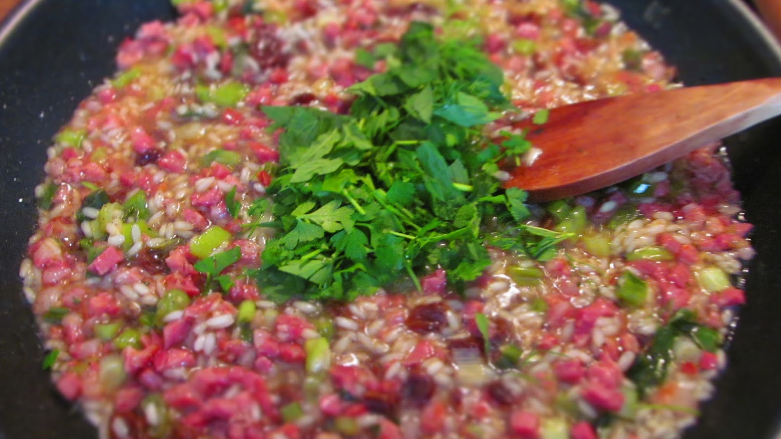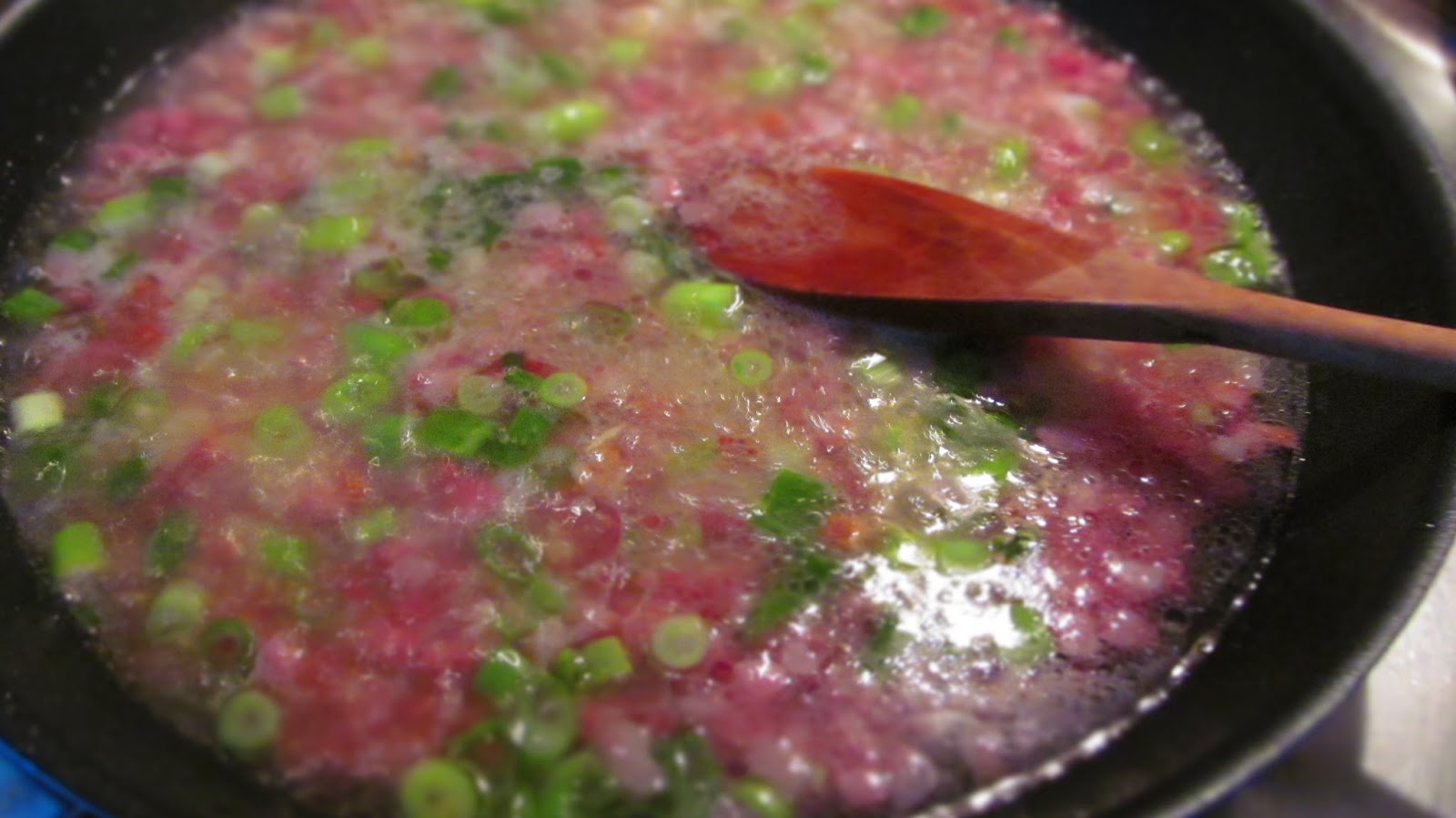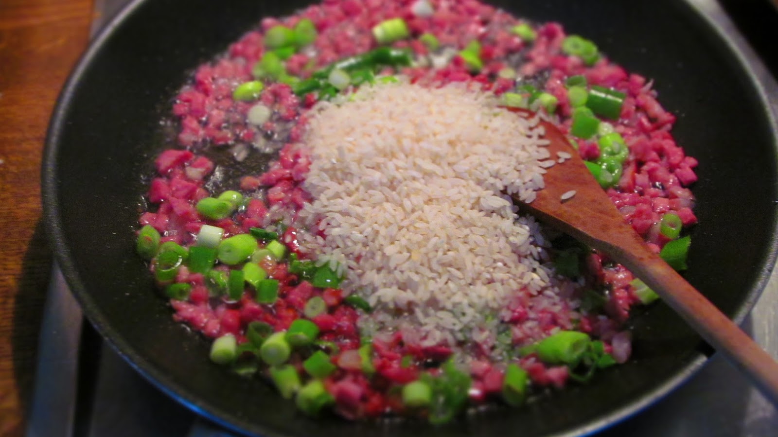 - Изсипвам ориза и разбърквам. Оризът се пържи само до прозрачност.