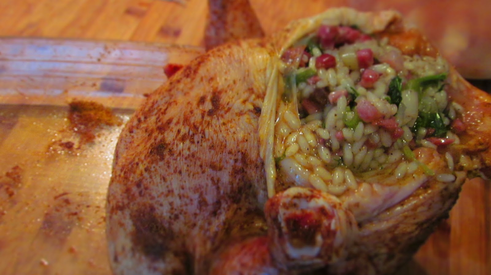 - С помощта на лъжица напълвам вътрешността на пилето с оризовата плънка.