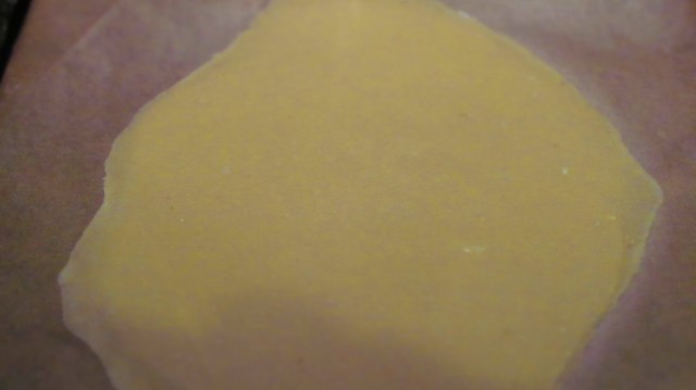 • От всяка топка, но върху хартия за печене разточвам възможно най-тънката кора. За да не Ви се мърда хартията, може да я залепите с тиксо за масата.