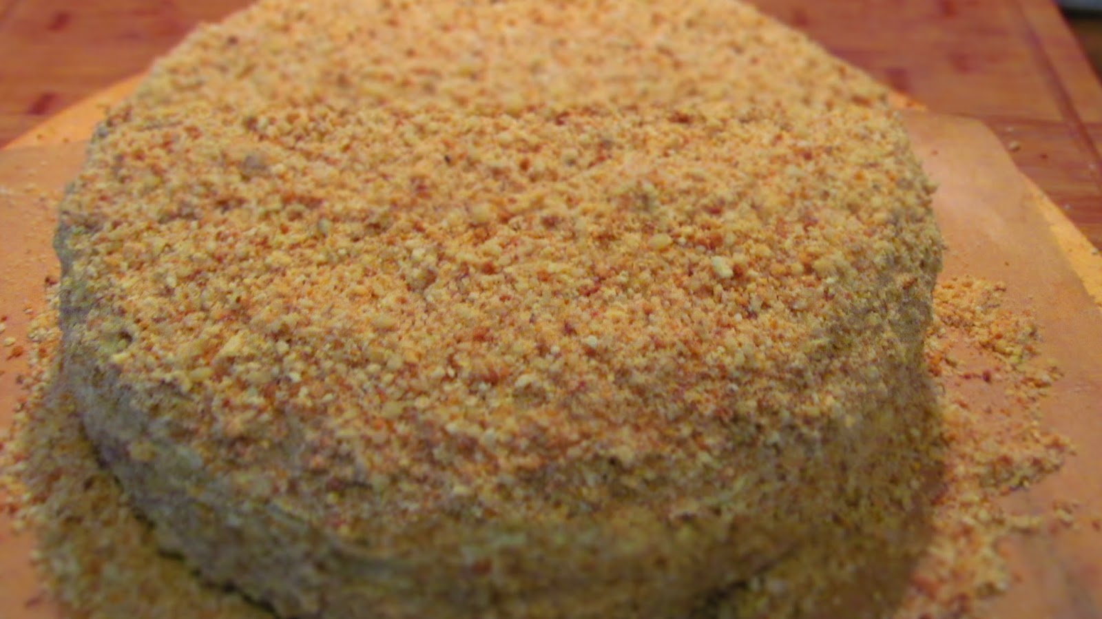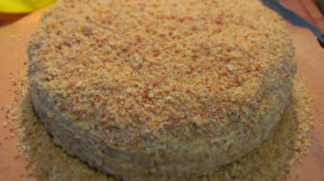 • Поръсвам обилно тортата отгоре и отстрани с трохите, омесени с орехи.