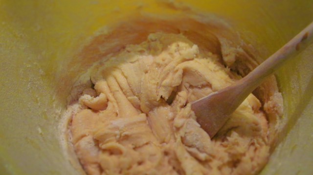 • Когато стане тестото гъсто, преминавам на разбъркване с дървена лъжица, до получаването на меко тесто, подходящо за месене с ръце.