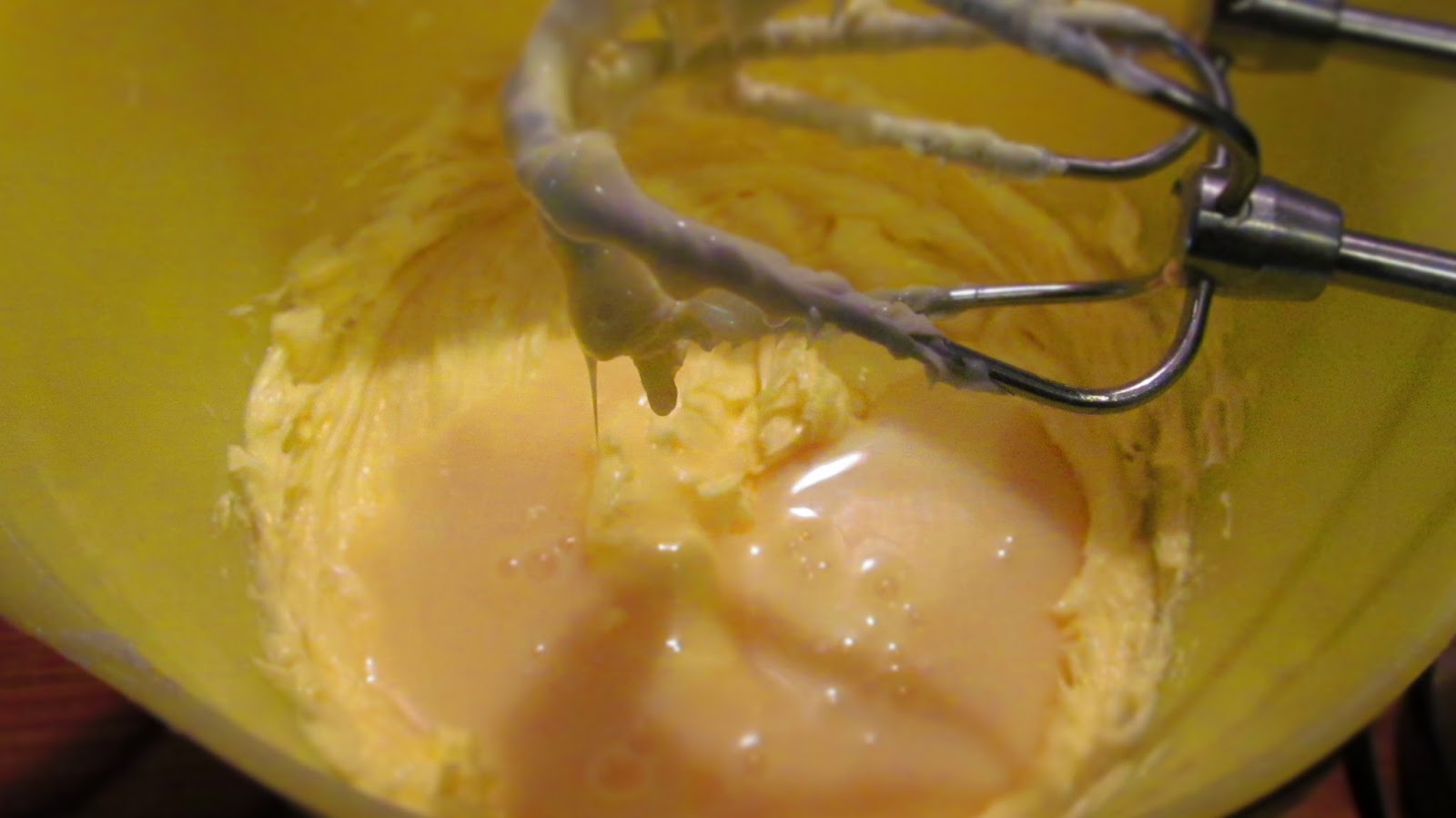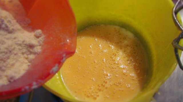 • Свалям купата от парната баня и бавно добавям брашното /размесено предварително с бакпулвера/, но с постоянно разбъркване с миксер.