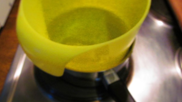 • В малка по размер тенджерка сипах студена вода и поставих купата за миксера отгоре, но така, че да не потъва във водата, а да се получи само парна баня. Котлонът е на 1,5 степен от възможни 3 степени. Старая се водата в тенджерката да не завира.