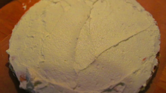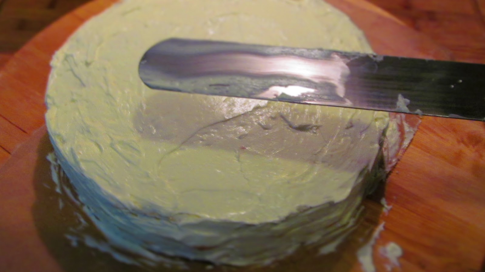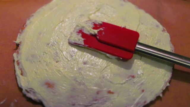 • Започвам сглобяването на тортата. Върху първия блат намазвам с маслен крем.