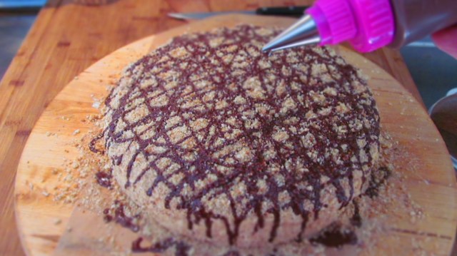 • Декорирам допълнително тортата с разтопен шоколад.