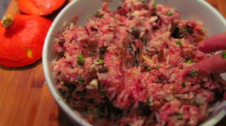 - В купа смесвам каймата, изцедения хляб, лука, чесъна, яйцето, магданоза, джинджифила, целината, сол и черен пипер на вкус.
