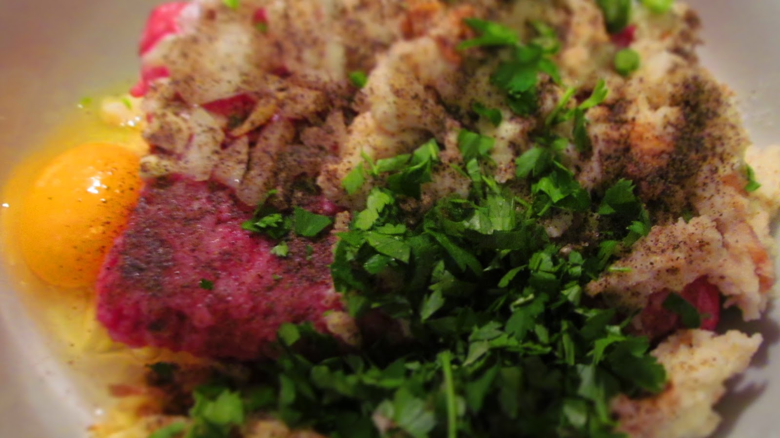 - В купа смесвам каймата, изцедения хляб, лука, чесъна, яйцето, магданоза, джинджифила, целината, сол и черен пипер на вкус.