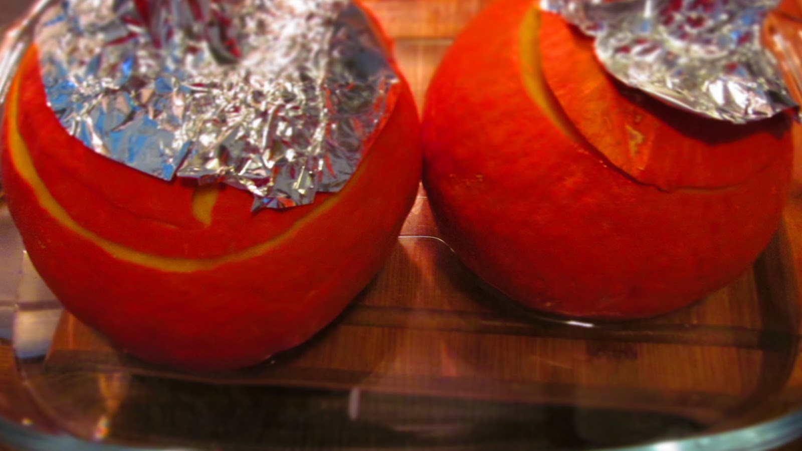 - Похлупвам тиквите с капачетата, но за да не изгорят капачетата при печенето, увивам в алуминиево фолио.