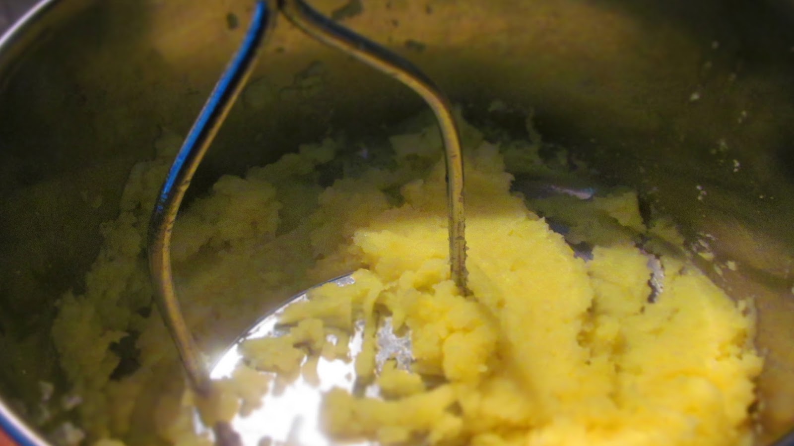 - Готовите и горещи картофи изцеждам от водата и намачквам с уреда за намачкване.